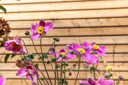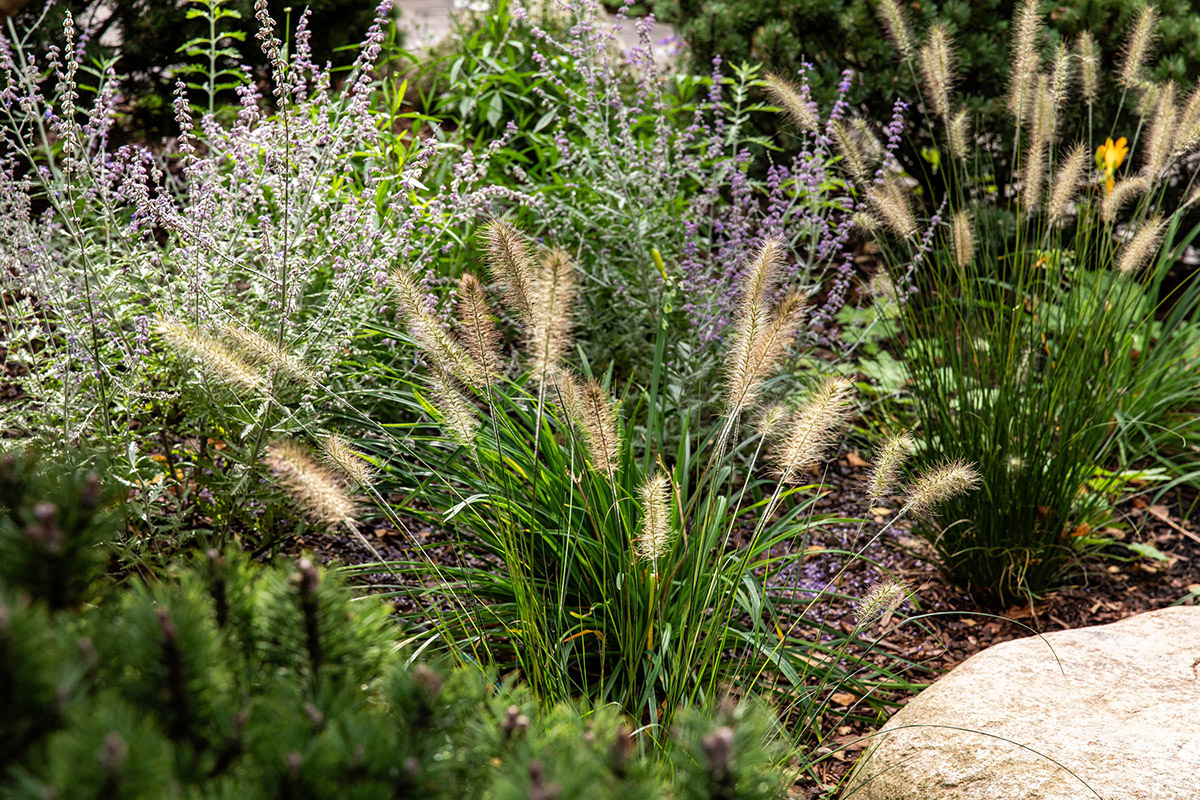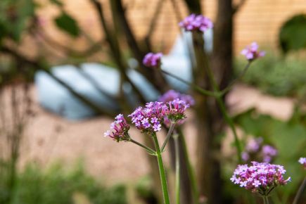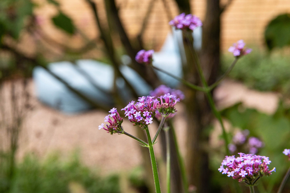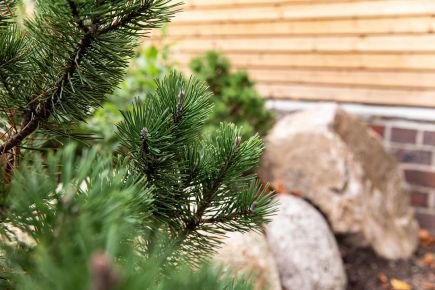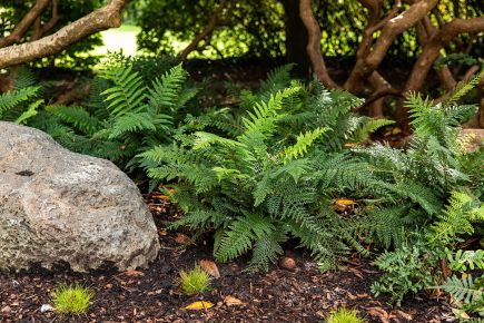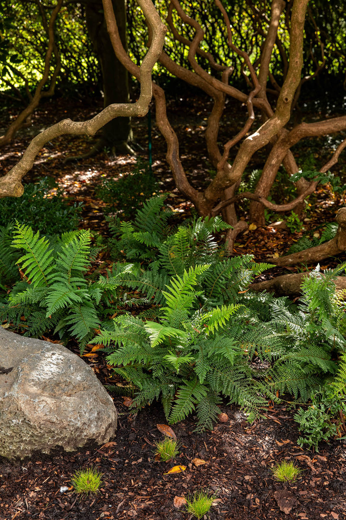 - Solitärgehölze wie Schlangenhaut-Ahorn und Schirm-Rispenhortensien