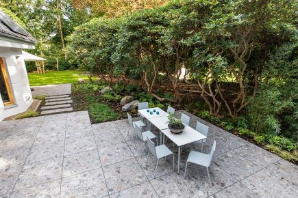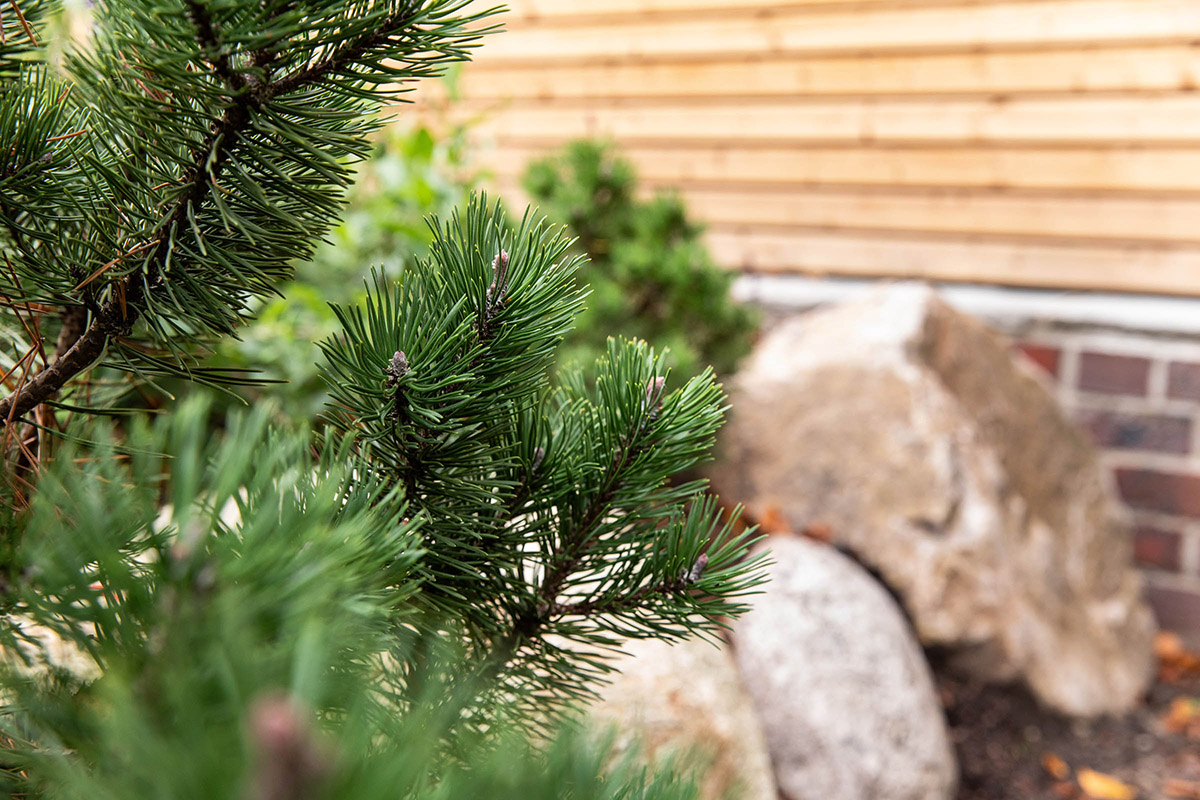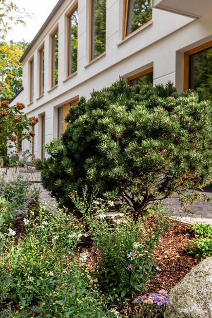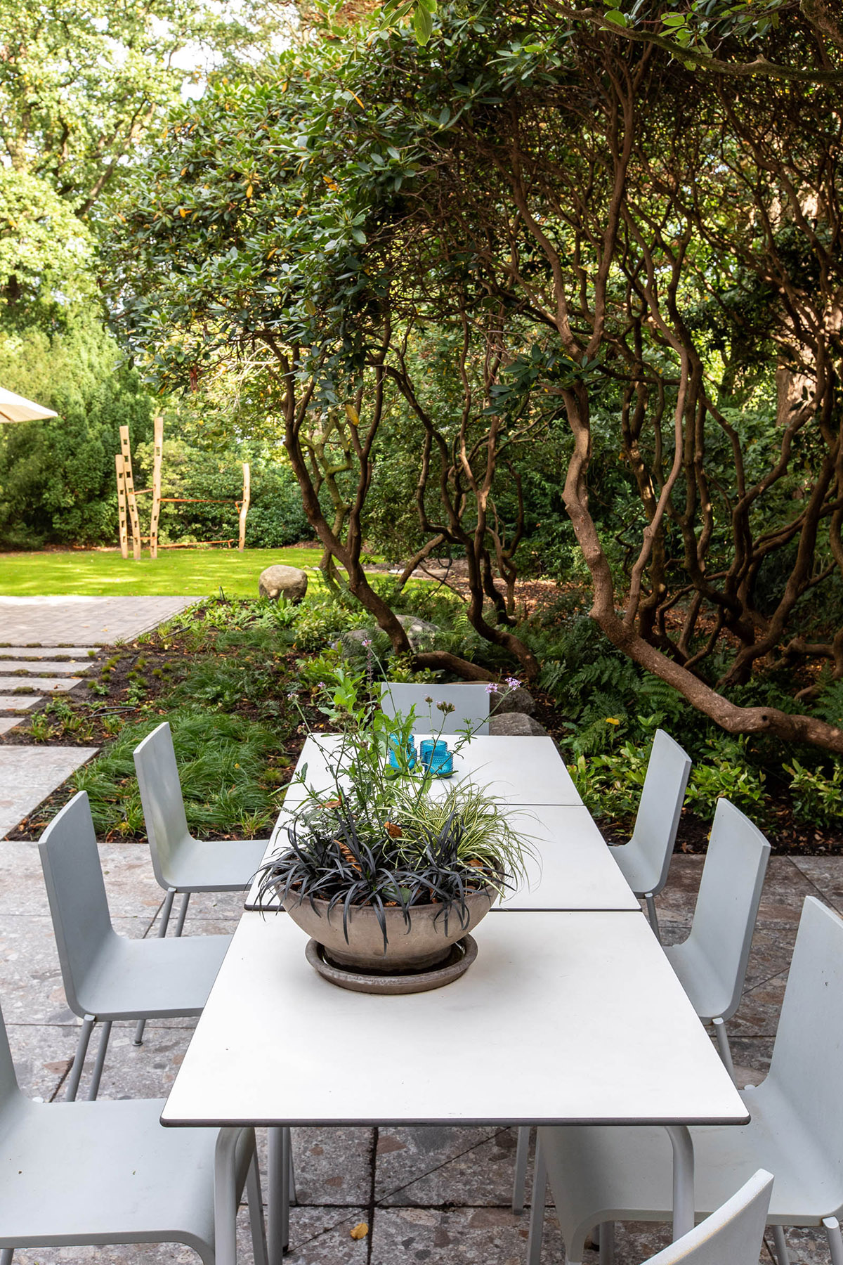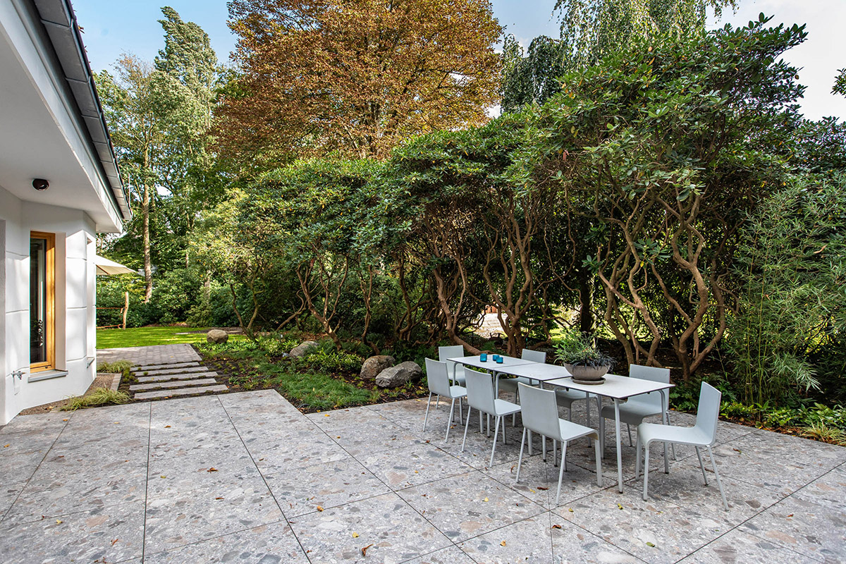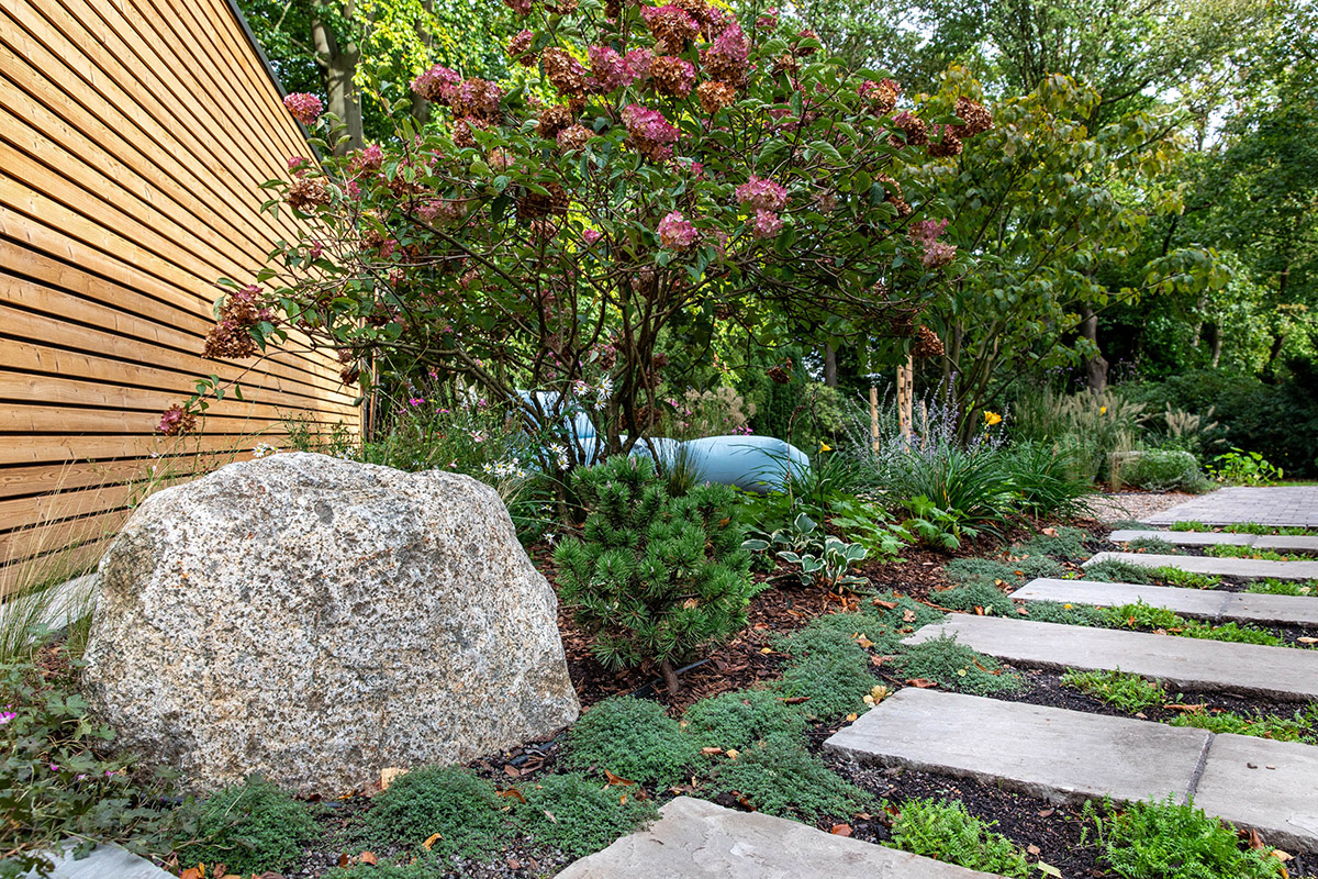 Bei den ersten Begehungen des alten, in die Jahre gekommenen und damals unbewohnten, Grundstücks fiel mir der Baum- und Gehölzbestand auf, mit dem ich gerne arbeiten und ihn erhalten wollte. Punktuell haben wir aus ästhetischen- und Sicherheitsgründen Pflanzen entnommen. Glücklicherweise sind die neuen Besitzer mit der Vision mitgegangen, auch einen alten Rhododendronbestand in die neue Gestaltung mit einzubeziehen. Der Garten bietet heute eine ganzjährige grüne Kulisse, auch aus dem Haus heraus. In den sonnigeren Bereichen wechseln Blütenpflanzen sich übers Jahr mit ihrem Aufritt ab.
