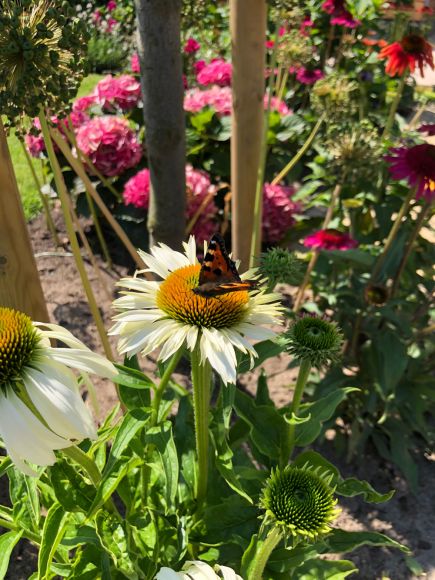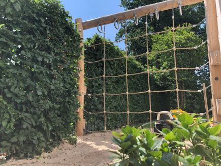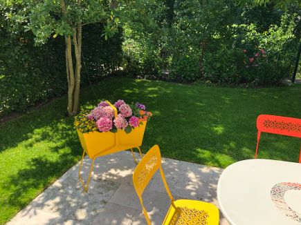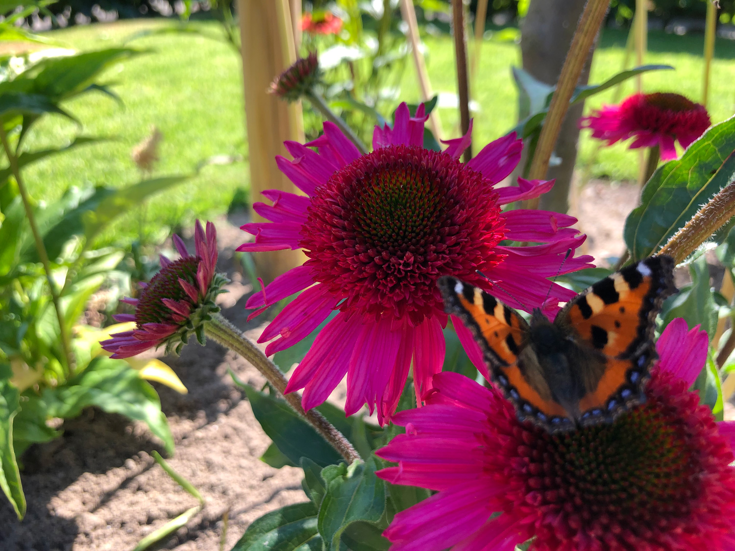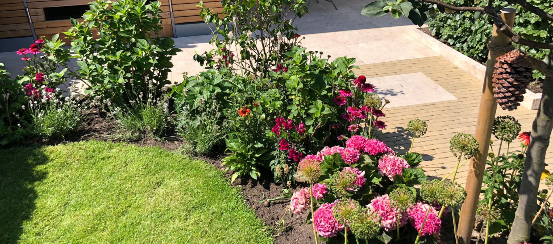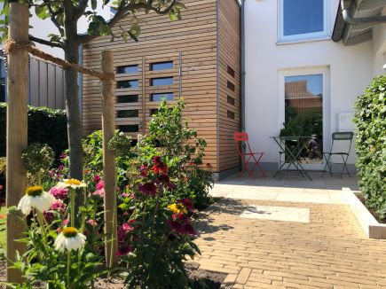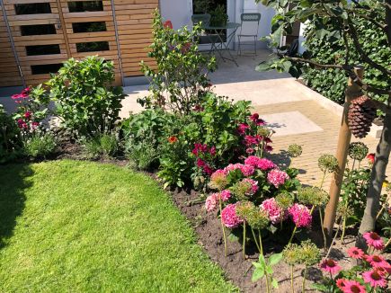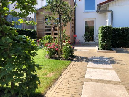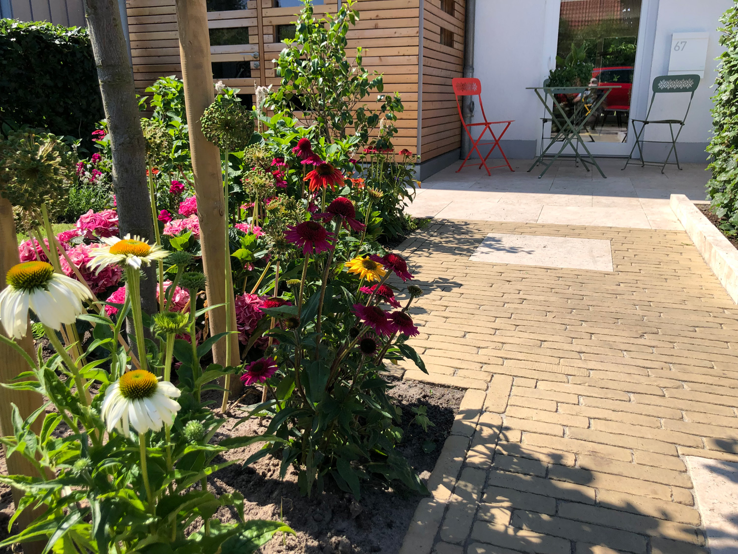 Für eine klare Raumaufteilung eines Familien Reihenendhauses sollten Haus und Garten teilweise umgebaut und umgestaltet werden. Klar war von Anfang an der Wunsch nach üppigem Grün in Verbindung mit hellen, freundlichen Materialien. Außerdem sollte Platz für Spielmöglichkeiten geschaffen werden. Den Garten haben wir im ersten Arbeitsgang mit vorgezogenen Buchenhecken-Elementen in zwei unterschiedlichen Höhen eingefriedet und teilweise unterteilt. Der hierdurch gewonnene Sicht- und Windschutz dient im Inneren des Gartens als Hintergrundkulisse für die Bepflanzung aus Stauden, Zwiebelpflanzen Hortensien und Rosen. Als Blüten-, Frucht- und Schattenspender stehen aus dem Altbestand eine Magnolie, Kirsche und Quitte im Garten.