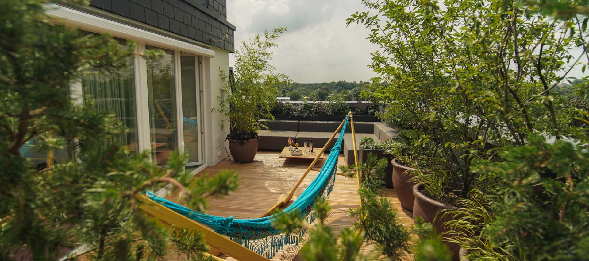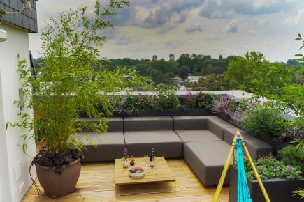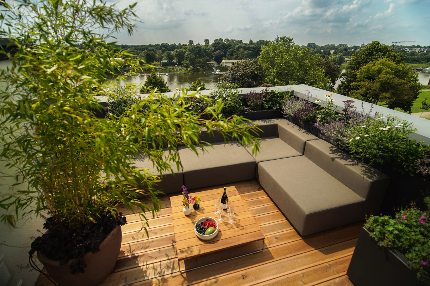 Der Wunsch für die Gestaltung der Dachterrasse war es, unterschiedliche Nutzungsbereiche zu schaffen. Es sollten ein Lounge-Bereich, eine beschattete Essecke und Ruhemöglichkeiten mit möglichst üppiger Bepflanzung entstehen. Die einzelnen Bereiche haben wir durch unterschiedliche Pflanzgefäße definiert, auch um teilweise Privatsphäre zu schaffen.