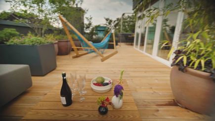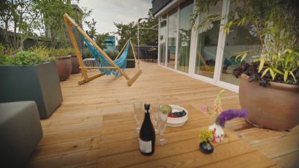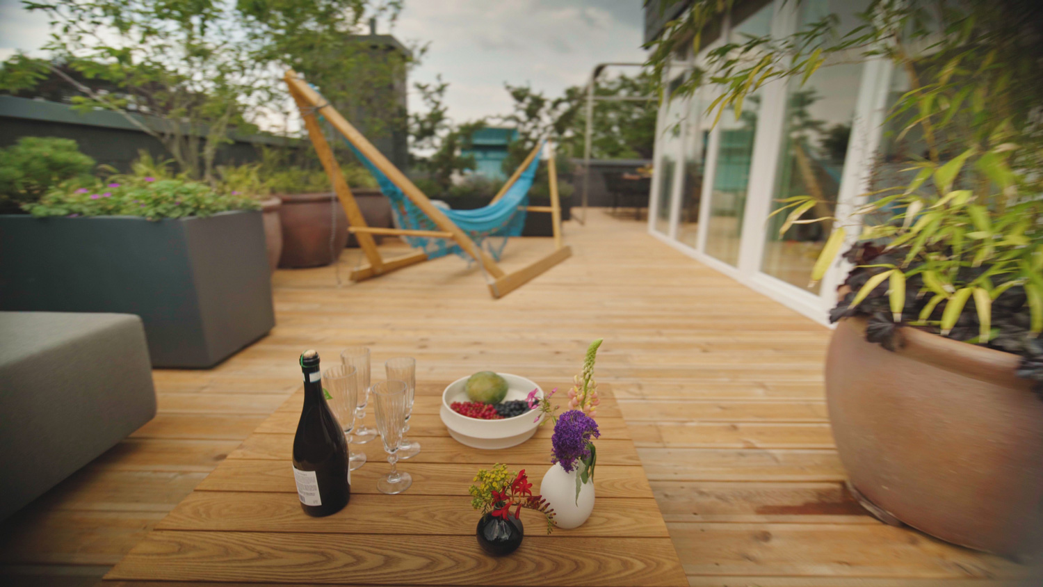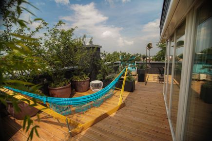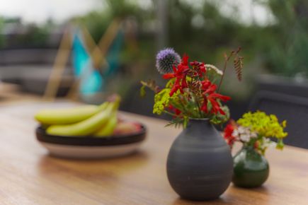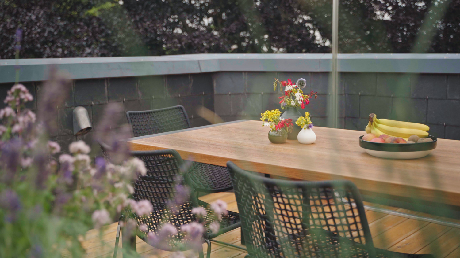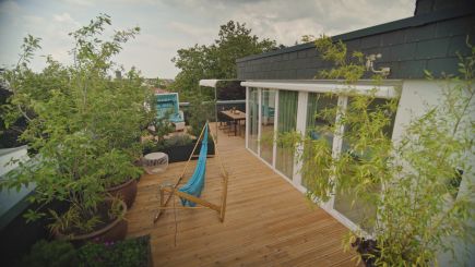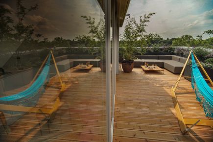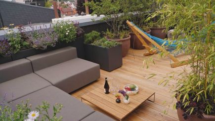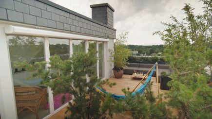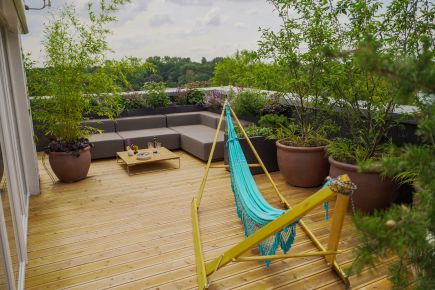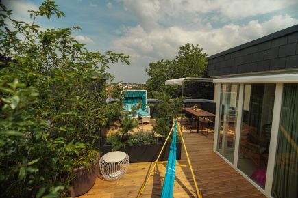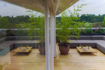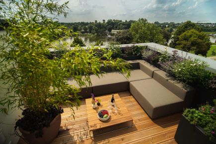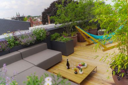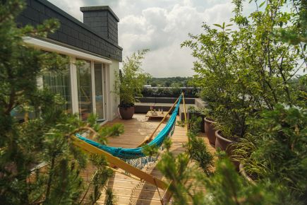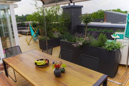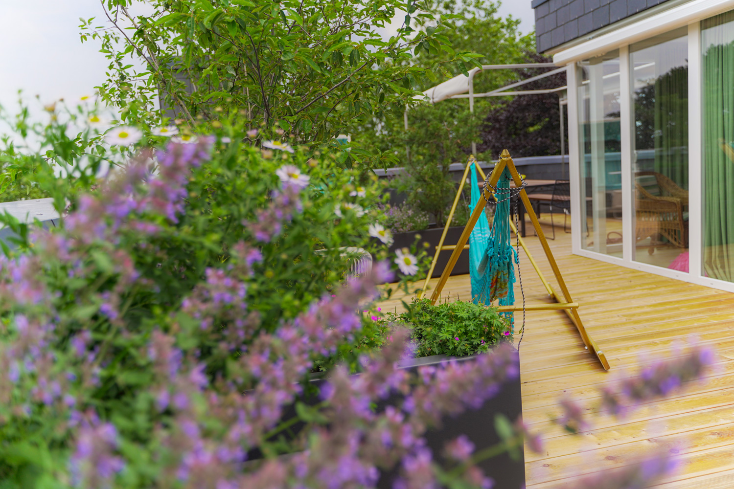 Die Bepflanzung ist blütenreich und es können Gartenkräuter und ein wenig Obst geerntet werden. Fast alle Materialien, Pflanzen, Möbel und Pflanzkübel wurden mit einem Autokran auf die Terrasse gehoben.