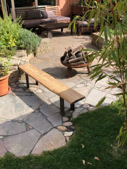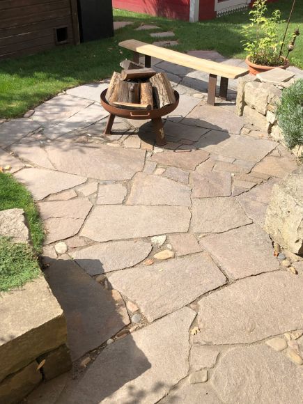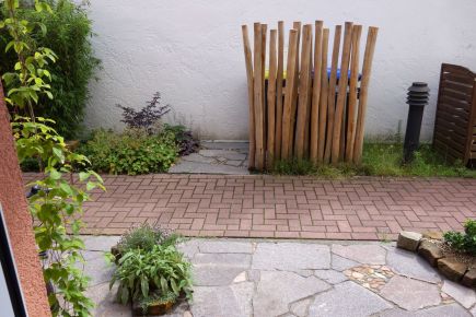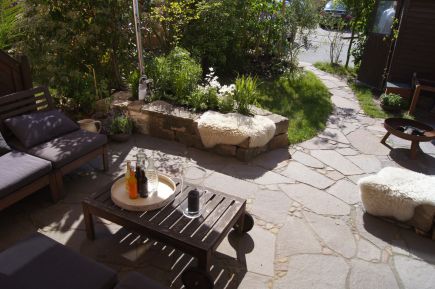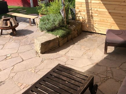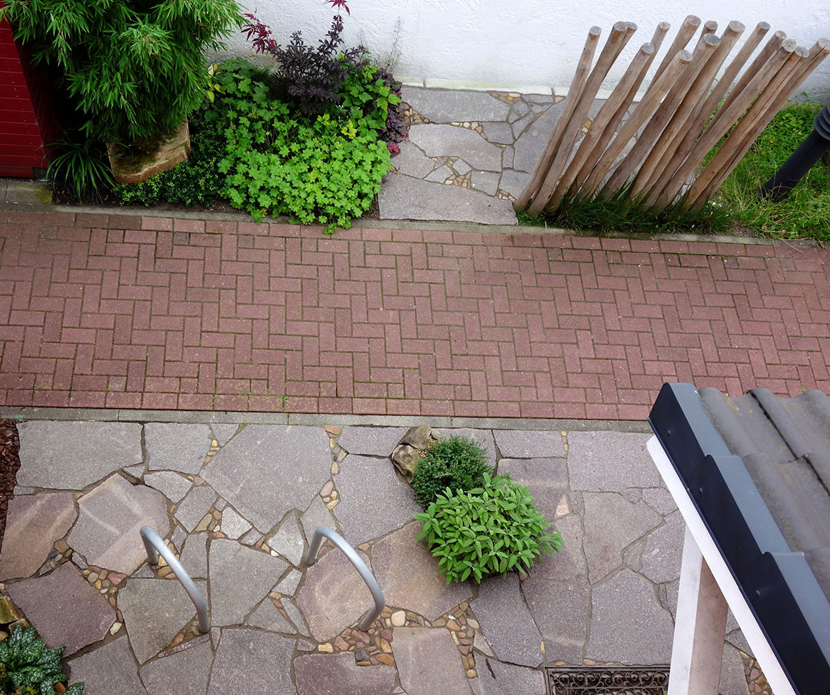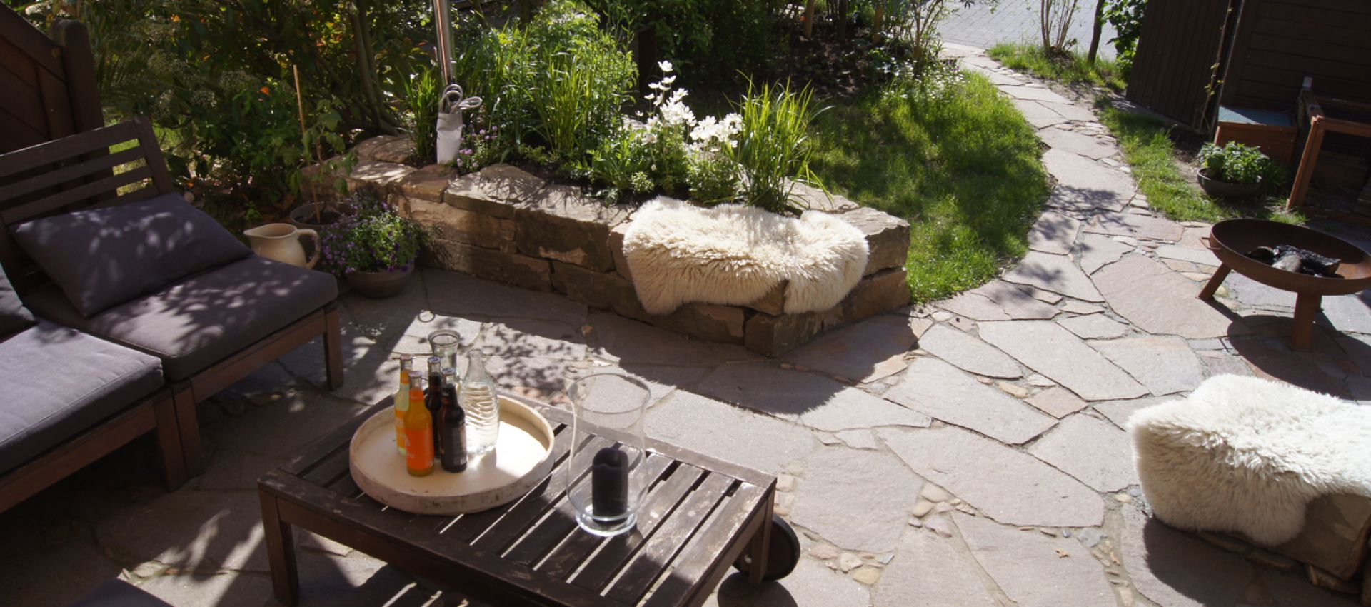Bei der Umgestaltung des Gartens der fünfköpfigen Familie ging es als erstes darum, Platz für Fahrräder zu schaffen, nachdem das Auto abgeschafft wurde. Die Mülltonnen sollten außerdem aus dem direkten Sichtbereich verschwinden. Die vorhandenen Terrassenmöbel wurden durch Sitzgelegenheiten ergänzt, zum Beispiel vor dem Haus oder an der Feuerschale. Es wurden polygonale Natursteinplatten verwendet, die wir in Teilbereichen mit Steckkieseln ergänzt haben. Für Hochbeete und Beet-Einfassungen haben wir regionalen Sandstein verwendet. Für die Verschattung, der nach Süden ausgerichteten Terrasse, wurde ein hochwertiges Sonnensegel aus einer Bremer Manufaktur aufgebaut. Ergänzend wurde später ein Sichtschutz sowie der Rasen von uns erneuert.