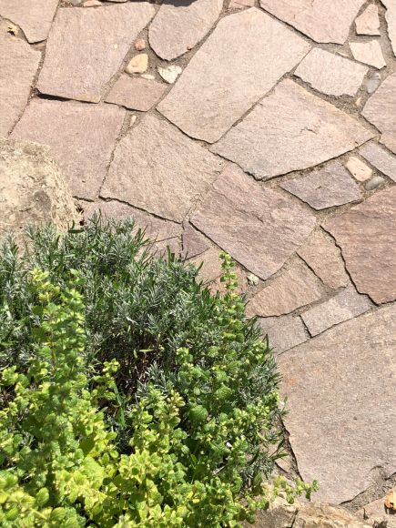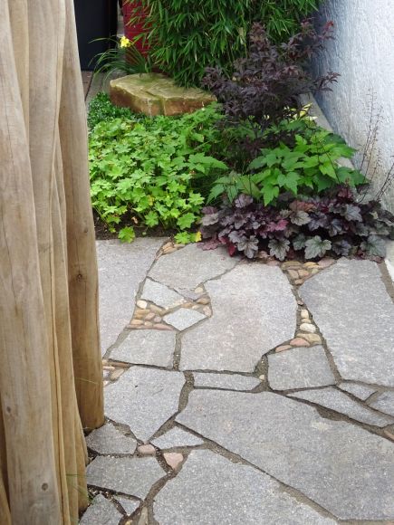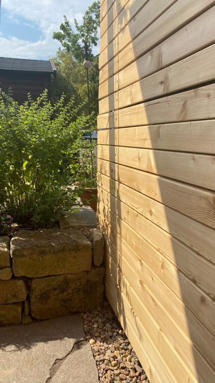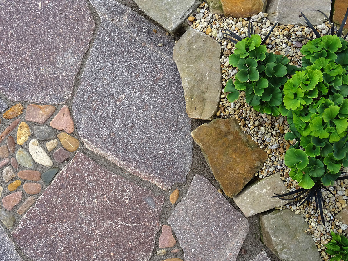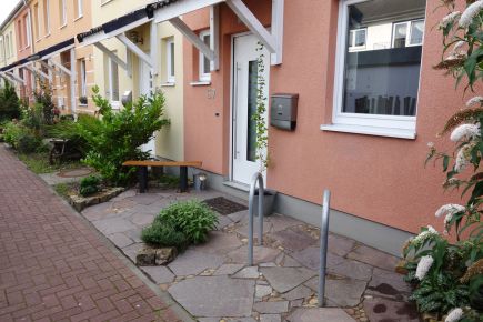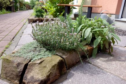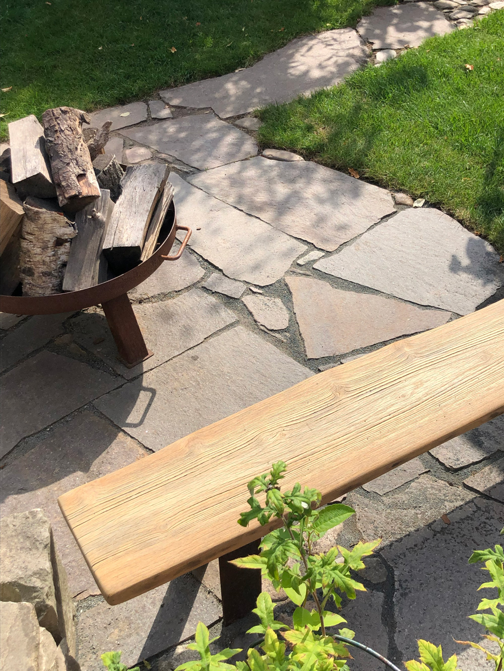 Bei der Umgestaltung des Gartens der fünfköpfigen Familie ging es als erstes darum, Platz für Fahrräder zu schaffen, nachdem das Auto abgeschafft wurde. Die Mülltonnen sollten außerdem aus dem direkten Sichtbereich verschwinden. Die vorhandenen Terrassenmöbel wurden durch Sitzgelegenheiten ergänzt, zum Beispiel vor dem Haus oder an der Feuerschale. Es wurden polygonale Natursteinplatten verwendet, die wir in Teilbereichen mit Steckkieseln ergänzt haben. Für Hochbeete und Beet-Einfassungen haben wir regionalen Sandstein verwendet. Für die Verschattung, der nach Süden ausgerichteten Terrasse, wurde ein hochwertiges Sonnensegel aus einer Bremer Manufaktur aufgebaut. Ergänzend wurde später ein Sichtschutz sowie der Rasen von uns erneuert.