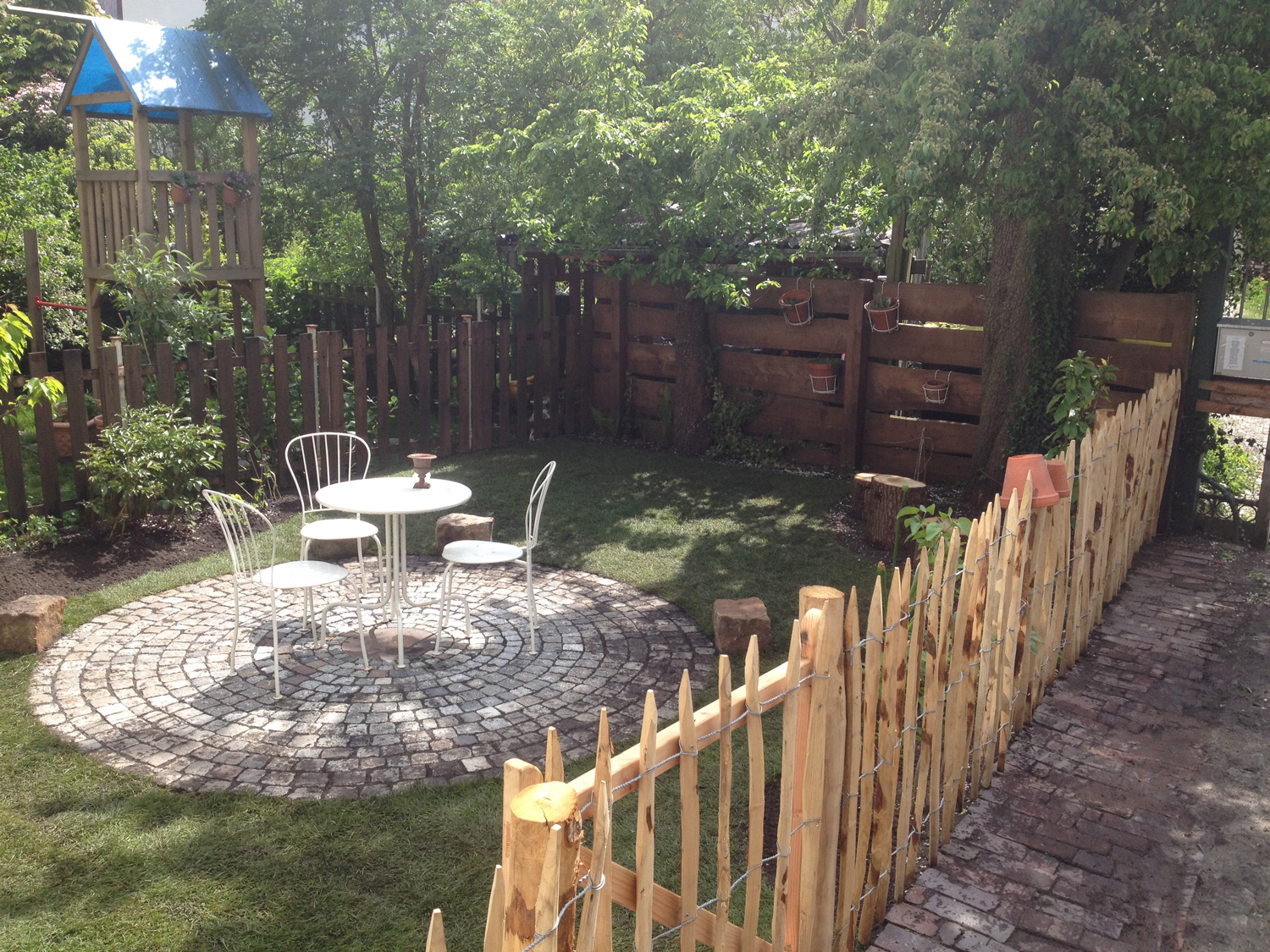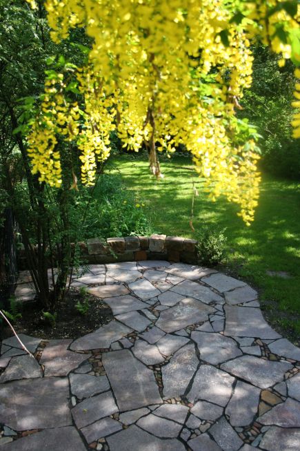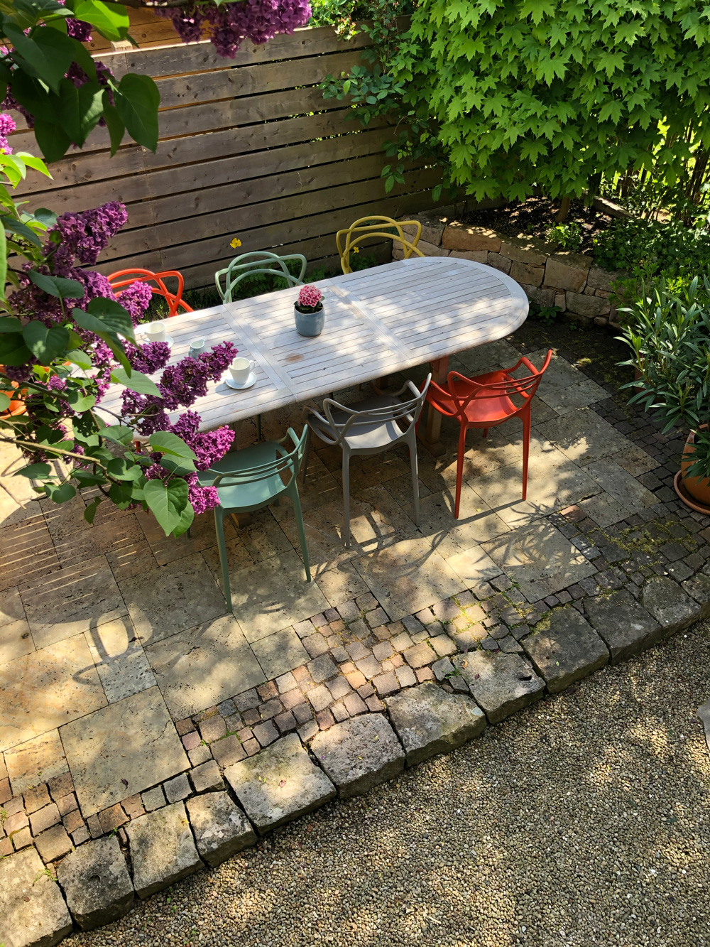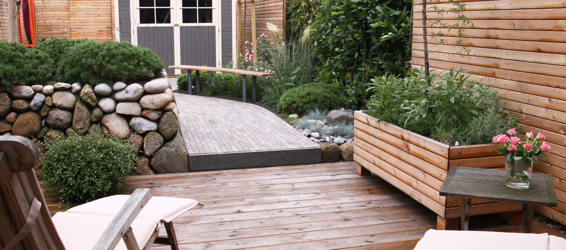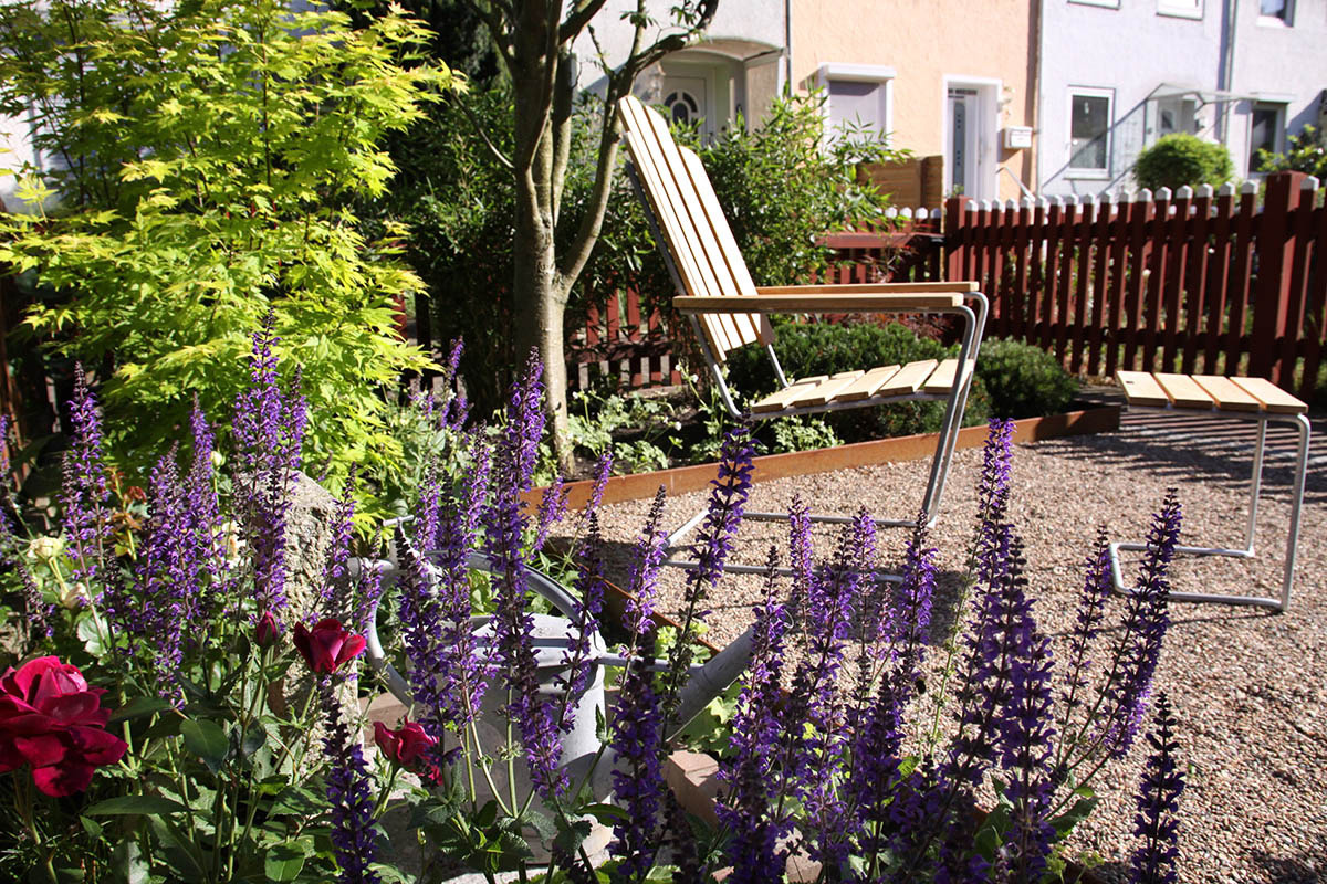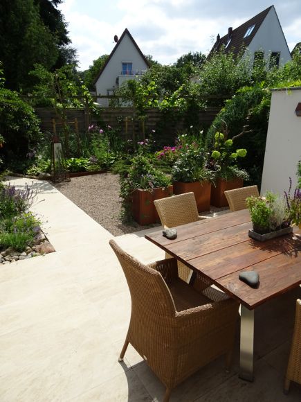 Um den eigenen Garten richtig genießen zu können, brauchen wir Terrassen und, wenn es der Raum her gibt, gerne auch weitere Sitzplätze. Die einen möchten im Tagesverlauf mit der Sonne gehen, die anderen suchen eher bewusst schattige Bereiche im Garten. Bei der Auswahl der Materialien spielen, neben persönlichen Vorlieben, auch das Zusammenspiel mit der Architektur und anderen vorhandenen Materialien eine Rolle. Außerdem sollte darüber nachgedacht werden, wieviel Fläche wir im Garten versiegeln und ob wir alternativ für den zweiten, dritten Sitzplatz nicht auch wassergebundene Wegedecken, Kies oder Mulch einsetzen können.